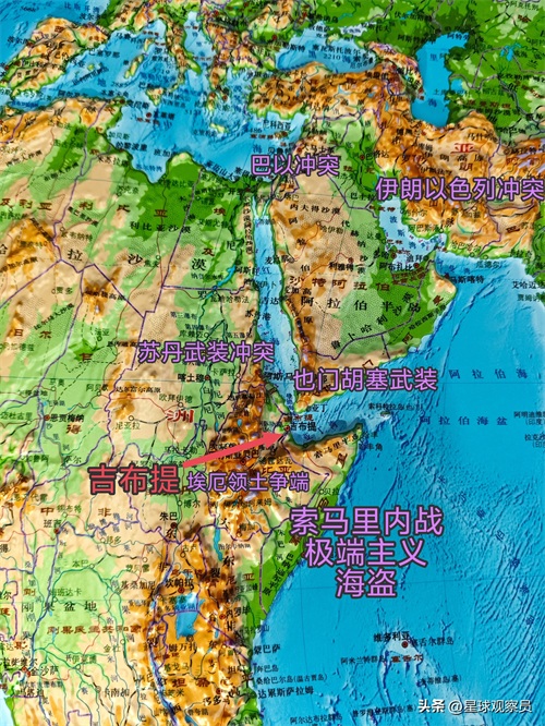 扼守曼德海峡和亚丁湾,控制红海至印度洋的航运咽喉,是中东和非洲反恐行动的前沿枢纽。