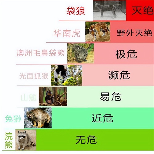世界上的物种很多,其中,我们将物种的濒危等级划分为:灭绝、野外灭绝、极危、濒危、易危、近危以及无危。