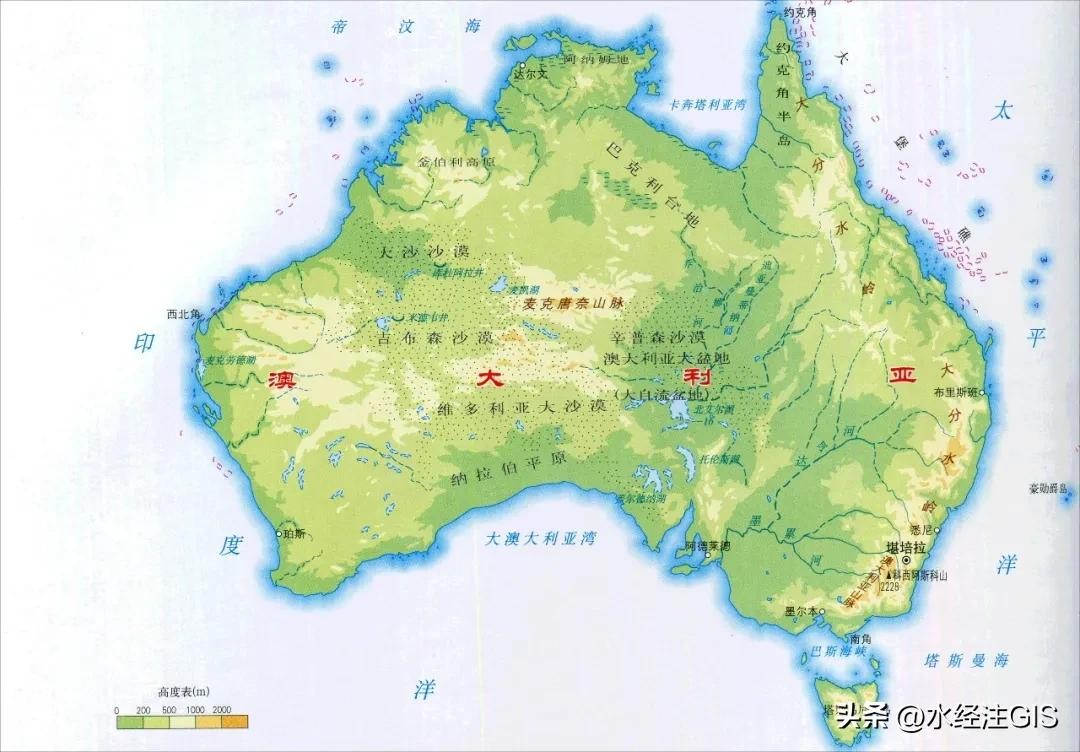 大洋洲地形以高原山地为主,岛屿众多,地势东西两侧高而中部相对较低。