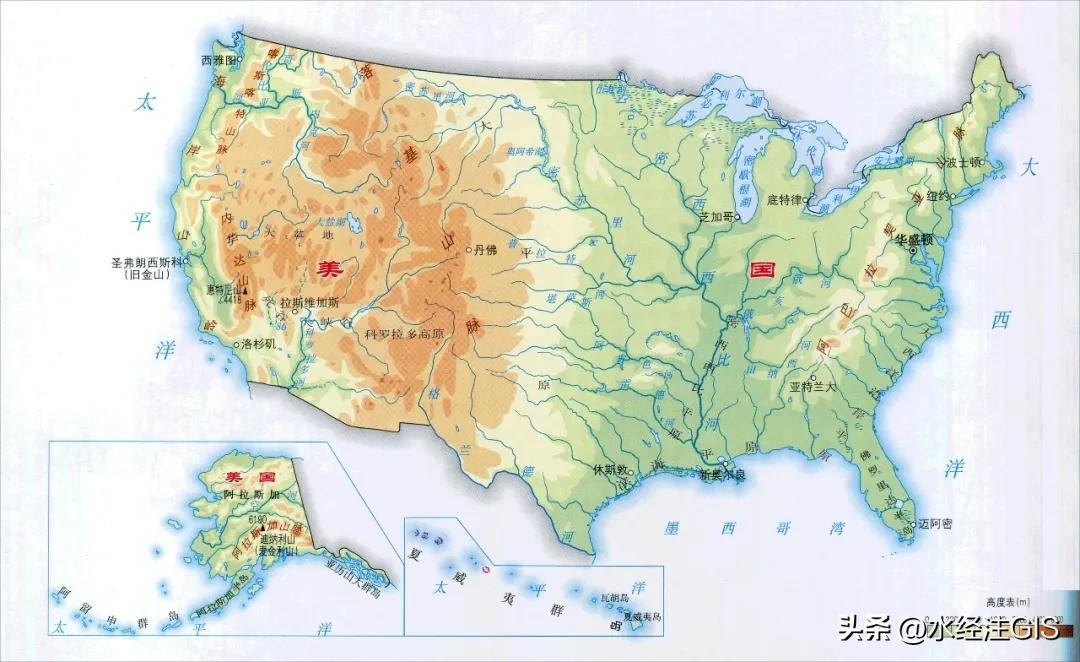 北美洲地形由西部高大山系、中部广阔平原和东部低缓高地组成,形成南北纵列分布的特征。
