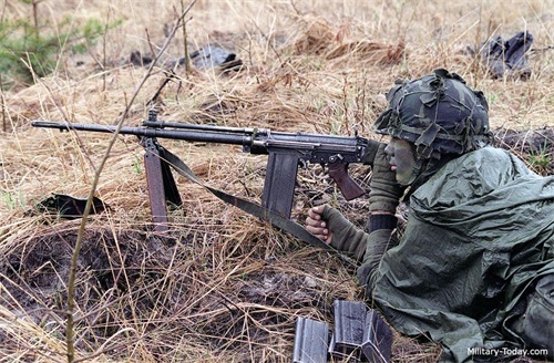 StG58。FAL是根据许可证在奥地利建造的。虽然这是一个轻枪管型号,它像重枪管型号一样安装了两脚架。