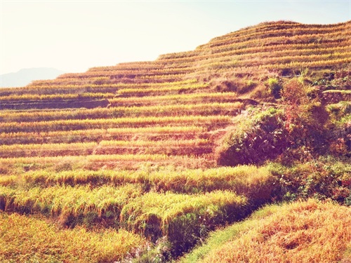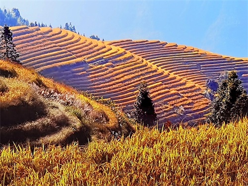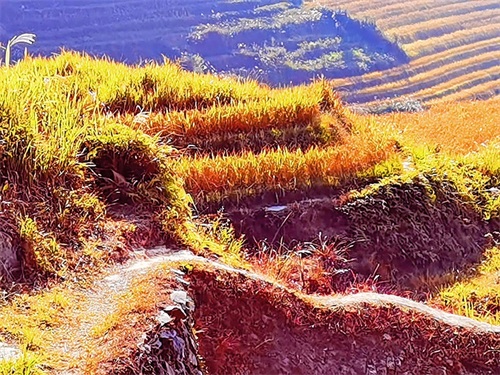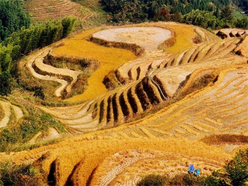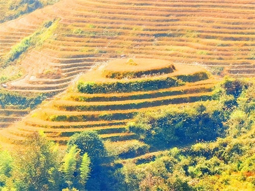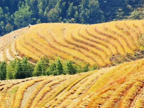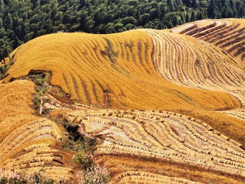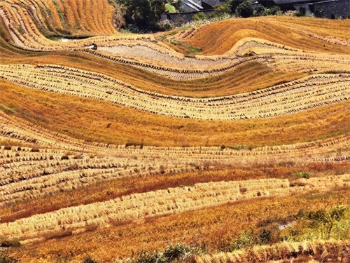 自海拔300米到海拔1100米的山巅,每块水田,都有两条曲线合围而成。层层叠叠,弯弯曲曲,上下田地等高,拾级而上。似层层海浪,似金色壮锦,似跳动的线谱,似登月的天梯,似贵妇飘逸的广袖,……
