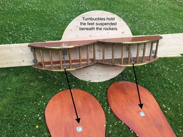 史蒂文建造的装置有一个圆形板,它在木板上保持平衡,安置在摇椅和木脚上。