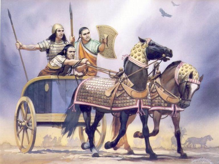 赫梯军队通常会把来自同一地区的士兵编入同一个部队,部队指挥官也会从这样不仅方便部队的管理也可以增加队伍的士气,由于赫梯本身就量产各种金属矿石,所以赫梯人的武器和盔甲在青铜时期一直都处于上乘水平,这些安纳托利亚的先民也特别擅长打硬仗。其中赫梯战车是那个时代最精锐的战车,赫梯战车把一般的战车做了改进,将车轮的车轴放到车厢的中间,加大了车厢的空间和稳定性,这样就使战车能够容纳更多的空间,有更强的冲撞力,当时的战车普遍是两人驾驶,而赫梯战车则是三人,驾驶员、弓箭手,还多了一个矛盾手,所以赫梯除了提供远程火力以外也可以在必要的时候冲入敌阵冲击对方的阵线。赫梯人的战车一年中有216天都要严格训练,你不仅仅是会射箭就能在战车上biubiubiu,你还得学习如何在战车加速,急转弯,跨过障碍物,颠簸的时候准确的射击敌人,还要学习三个队友间的相互配合,不同于其他同时期只用于提供远程火力的战车部队,如何结阵冲锋也是战车训练的项目,不仅有白天训练,还有夜间训练。这样高强度的训练造就了当时最强大的战车部队。