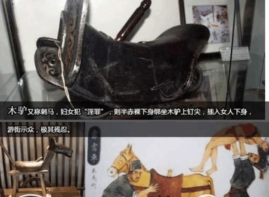 木驴又称刺马,妇女犯“淫罪”,则半赤裸下身绑坐木驴上钉尖,插入女人下身,游街示众,极其残忍。