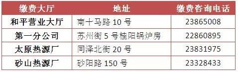 注:缴费时间:1.当年采暖费缴纳时间为每年的4月1日-10月31日,陈欠采暖费全年工作日均可缴纳;2.营业厅营业时间为8:30-17:00(现金收到下午3点,刷银联卡缴费到17:00),请携带供暖缴费卡或所需缴费的房屋详细地址;3.办理停供和恢复供热的用户也可以现在携带身份证、房屋产权证和缴费卡到所属供热营业厅办理。