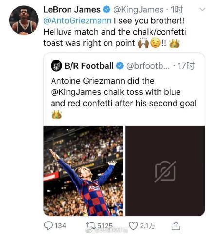 【格列兹曼进球后“洒镁粉”庆祝 詹姆斯回应:动作很到位】在巴塞罗那同皇家贝蒂斯的比赛中,梅开二度的格列兹曼在进球后模仿了一把篮球巨星詹姆斯的洒镁粉动作。此举收到了詹姆斯本人的回应。 詹姆斯在社交媒体上回复道:“我看到了你的庆祝动作啦,老兄!比赛很精彩,庆祝动作很到位。”