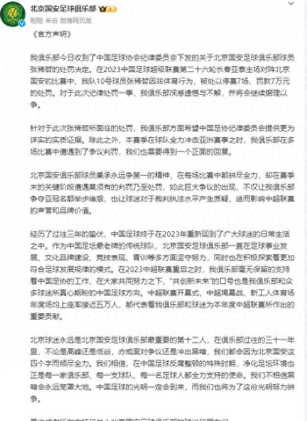 张稀哲被禁赛,国安声明:遗憾+不解!不相信黑暗会永远笼罩大地