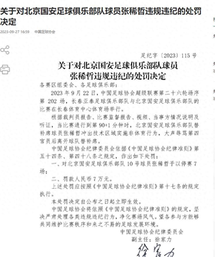 中国足协对此表示了强烈的不满,并迅速作出了决策:张稀哲禁赛七场,并罚款七万元。这意味着张稀哲本赛季已经无法再为国安出战。这一判决无疑对于国安,尤其是在争冠的关键时刻,是一个巨大的打击。