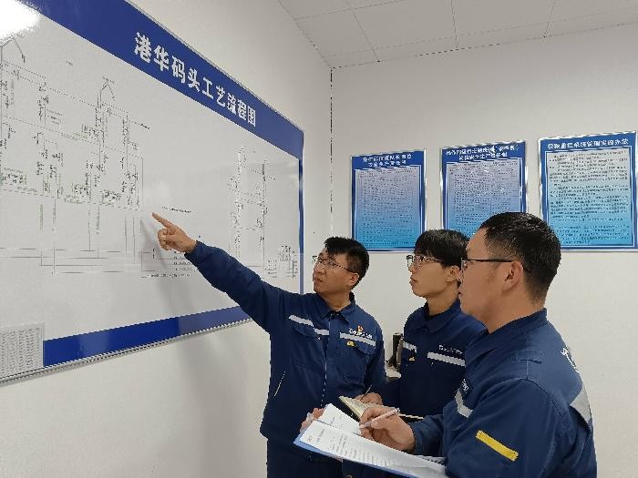 为实现项目“竣工即投产”的目标,LPG码头运营前,港华码头分组赴青岛港董家口液体化工码头跟班对标学习。三个月时间,跟着青岛港师傅们取经,同吃同住同劳动,通过轮岗跟师实践、专业理论培训、现场实操观摩,从技术“小白”到熟练掌握液化烃装卸专业技能,他们将理论知识与实际操作紧密结合,确保每一次作业万无一失。