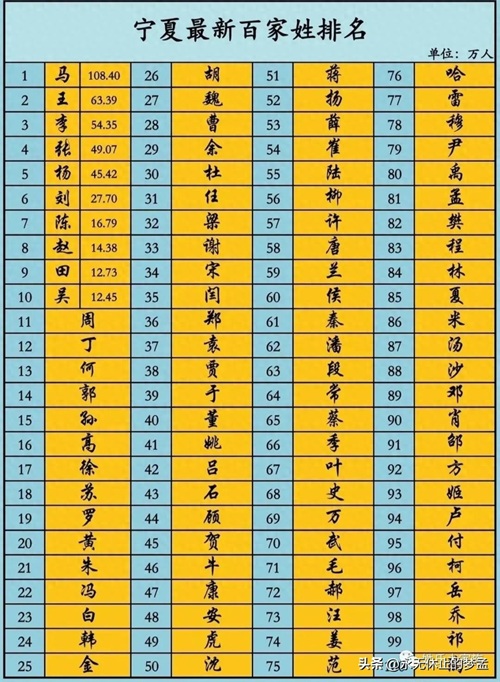 中国北方基本是“王姓”的天下,但在宁夏百家姓中,未列入全国前10的马姓却位居榜首,以108万多人口成为宁夏的爆款姓氏,也是唯一一个人口超过100多万的姓氏,比排在第二名的王姓 还多了45万人口。