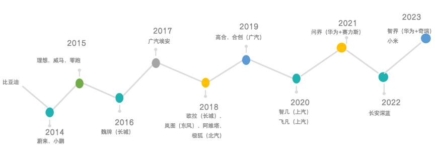 如果把 2014 年作为分水岭,会发现,新势力造车企业出现之后,广汽、长城、上汽、长安,几乎国内所有的传统车企都陆续推出电车品牌,走的基本都是豪华高端的路线。大家的目的都很一致,在一个还没有第一品牌的赛道里,打定位战。