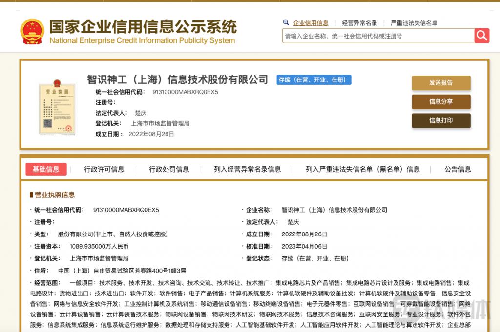 国家企业信用信息公示系统显示,智识神工是一家拥有通信技术、AI 技术和 IC(集成电路)设计技术的软件和信息技术公司,注册资本为 1090 万人民币,经营范围包括技术服务、技术开发、技术咨询集成电路芯片及产品销售,集成电路芯片设计及服务,技术进出口等。楚庆持股比例达 42.07% 左右,是公司法人代表、董事长、总经理。智识神工研发团队来自华为、海思、展锐以及复旦等。