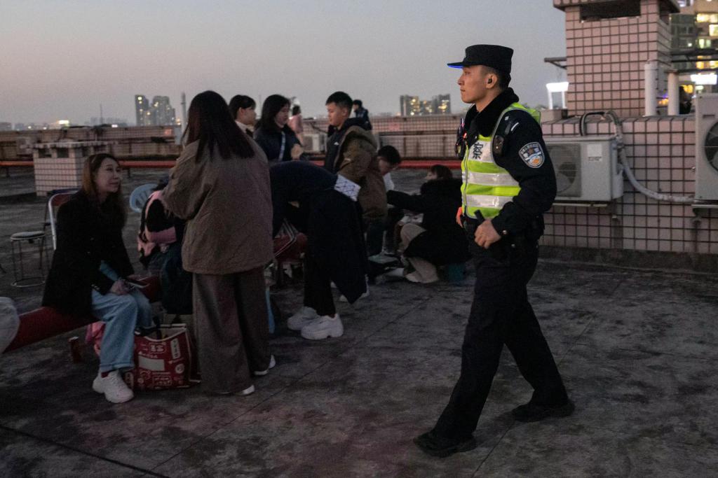 晚上六点多,黄沙地铁站附近挤满了前来观看烟花的市民,摩肩接踵。过街天桥上,一位民警拿着喇叭反复呼吁:请往下面走,桥负荷不了那么多人。围栏边,身穿制服的警察成为求助对象。哪里有厕所、预约了要怎么进入……他们不停地回答、解释,并提供其他可观看位置的选择。周边一处高楼上,有十多位居民在天台等待表演开始,民警带着安保人员提前到位执勤,防止发生事故。