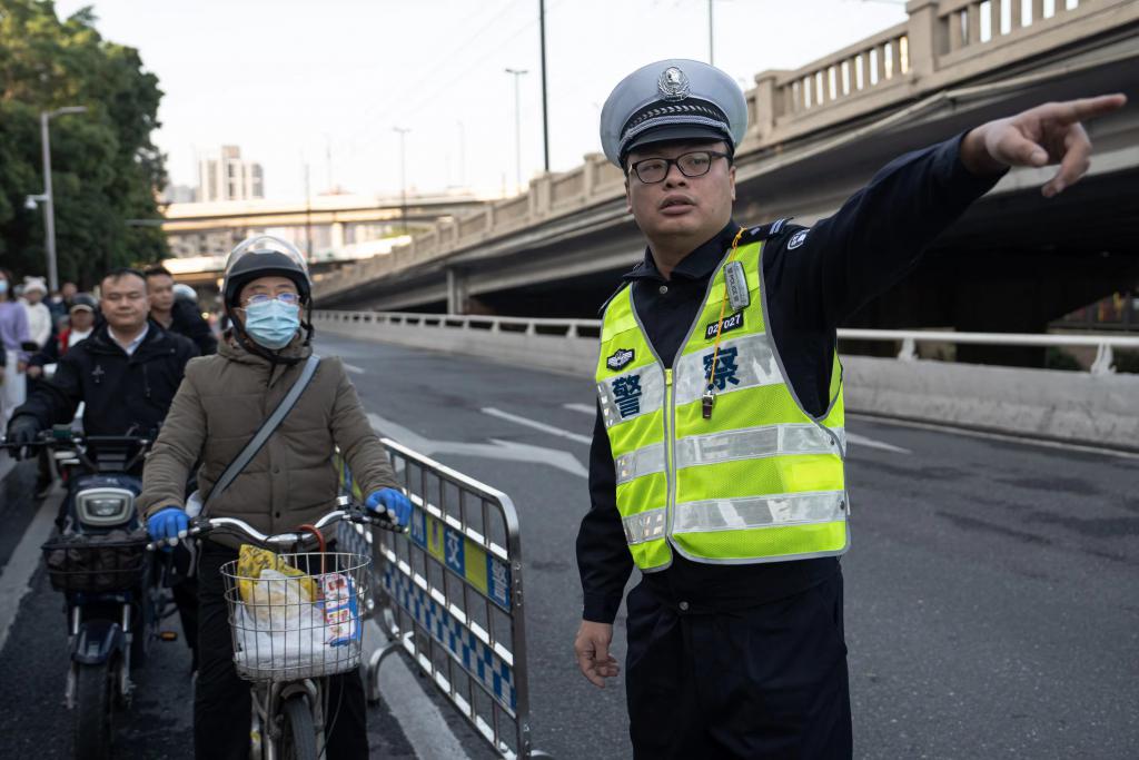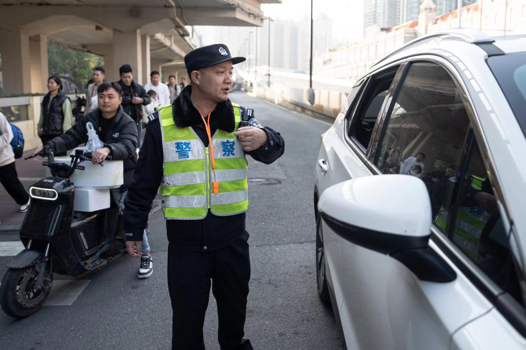 下午 3 点左右,地铁站文化公园 E 出口外的立交桥下,车辆和人员前行速度明显变缓。通向人民桥的马路上,数辆警用摩托车连成线,隔开机动车和非机动车、行人。荔湾交警大队民警刘智锋在现场指挥," 发现电动自行车或者共享单车过来,要马上指引离开,有机动车送客也要避免长时间停留,目标是维护路面畅通。"