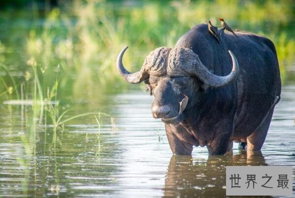 非洲野水牛是一种体长在2.1-3.4米的群居动物,通常牛群中最强壮的公牛会成为族群的领袖,这种夜行性动物在白天通常会避开非洲草原上的烈日高温,并会躲在阴凉处或浸泡在水池中降低身体温度。