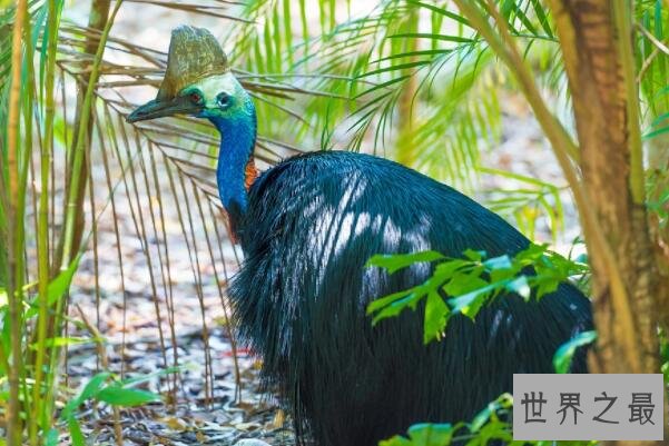 鹤鸵又被称为食火鸡,是一种头部呈蓝色、双翼早已退化不能飞行的鹤鸵目鹤鸵科鸟类,虽然不能飞行但在热带雨林地区栖息时却非常擅长奔跑和跳跃,机警凶猛的个性,使得这种以种子和浆果为食的动物具有较强攻击性。