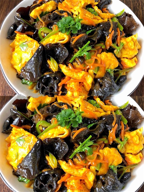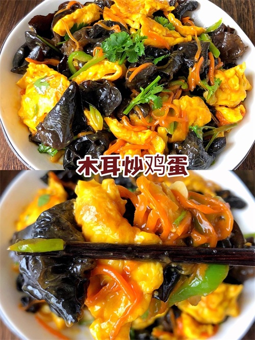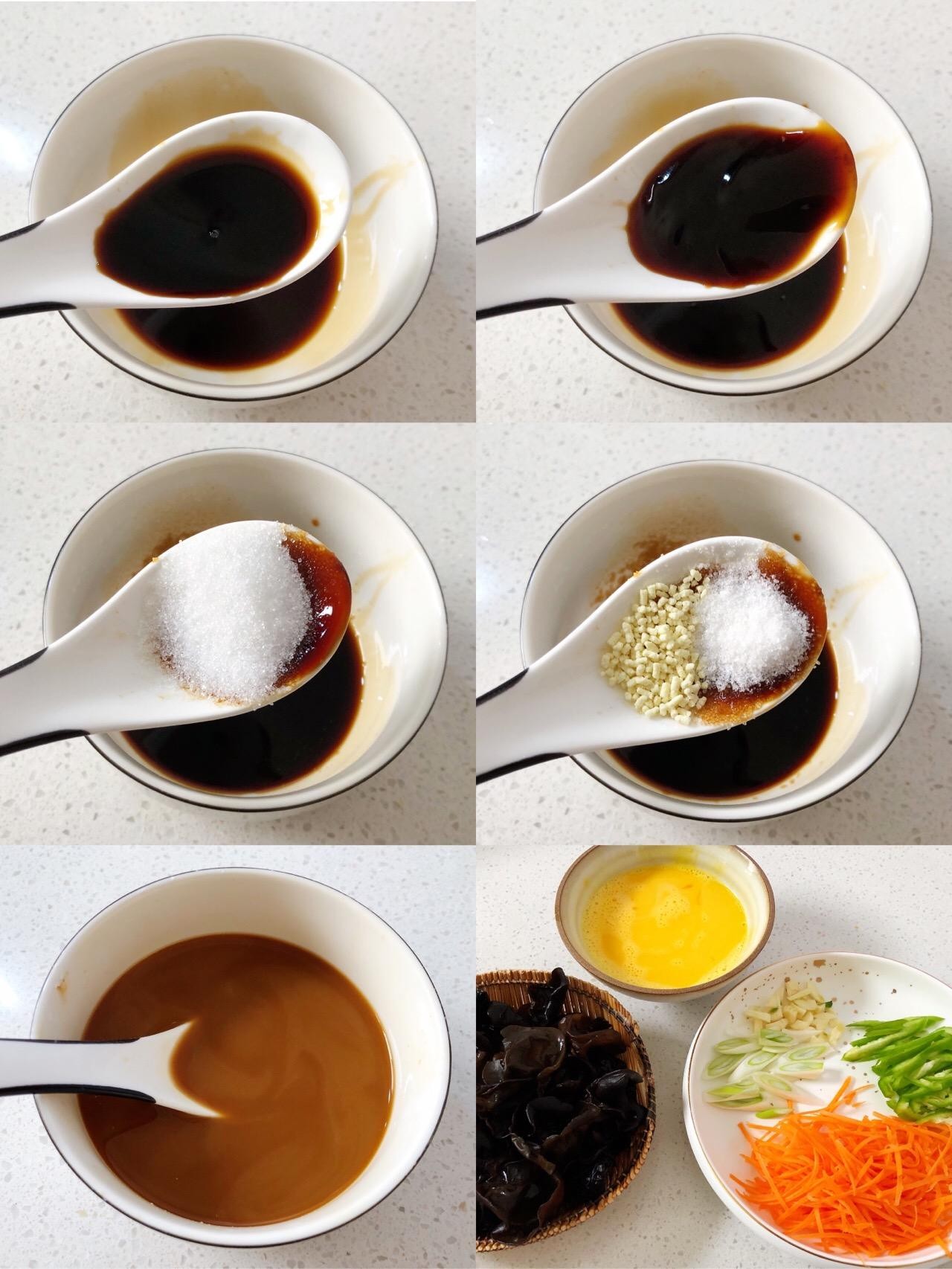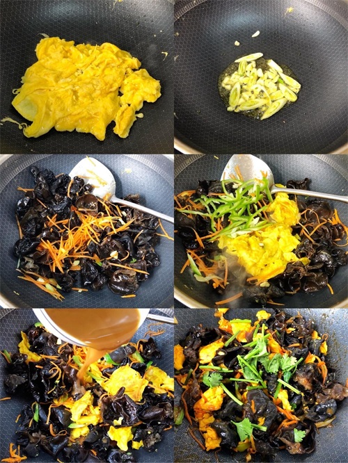 3️⃣锅里另放油烧热,加葱炒香,放黑木耳和胡萝卜炒1分钟,加入鸡蛋和辣椒丝炒匀,倒入料汁翻炒均匀,出锅前撒香菜段即可。