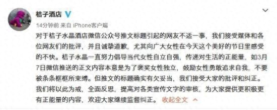 我们接受媒体和网友对橘子水晶酒店微信公众号推文标题引起的不适的批评,并诚挚致歉,特别是对广大女性在这个美好的假期感到不舒服。 橙水晶一直努力倡导当代女性自立自强,传递生活正能量。 例如,3月7日在微信上发布的文字内容,意在歌颂女性独立,鼓励女性勇敢追求自我,不受条条框框的束缚。 不过推文的标题确实不妥,我们接受大家的批评和指正。 我们将以此为鉴,全面反思,完善对各类宣传文字的审核,为您提供更多积极向上的内容。 欢迎您继续监督和指正。