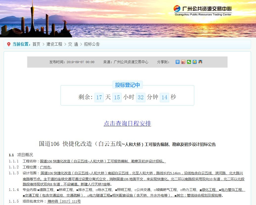 近日,广州公共资源交心中心发布《国道106 快捷化改造(白云五线~人和大桥)工可报告编制、勘察及初步设计招标公告》,公告内容指出,国道106 (白云五线~人和大桥)将进行快捷化改造。