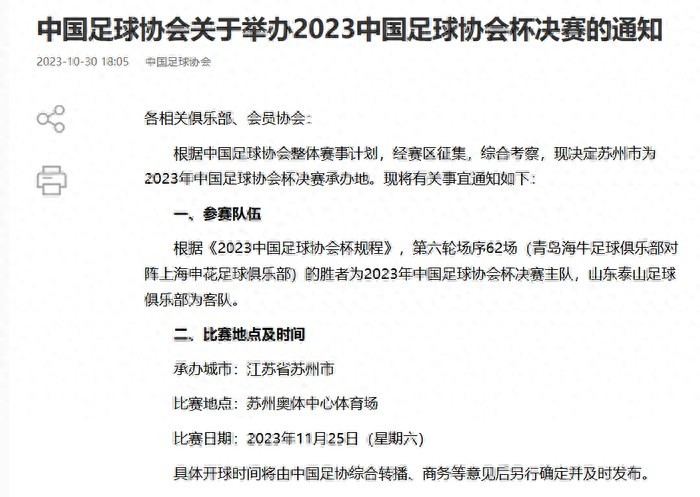 10月30日,中国足协官方宣布,2023赛季足协杯决赛定于11月25日在苏州举行。