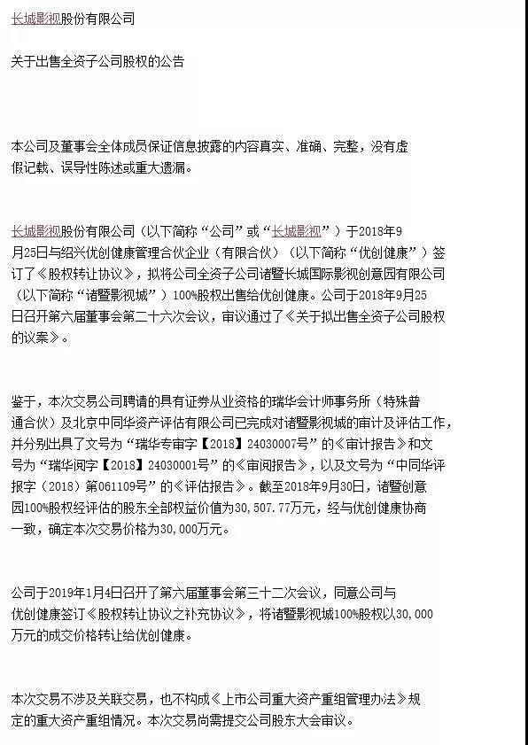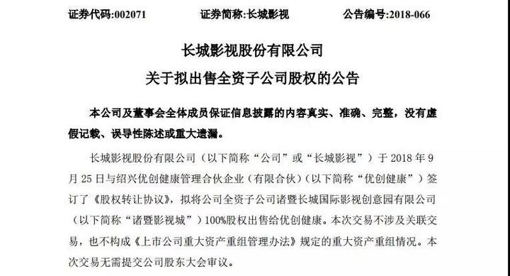 早在2018年9月底,长城影视就与绍兴优创健康管理合伙企业(有限合伙)签订了《股权转让协议》,拟将公司全资子公司诸暨长城国际影视创意园有限公司100%股权以不得超过3亿元的定价出售给优创健康。