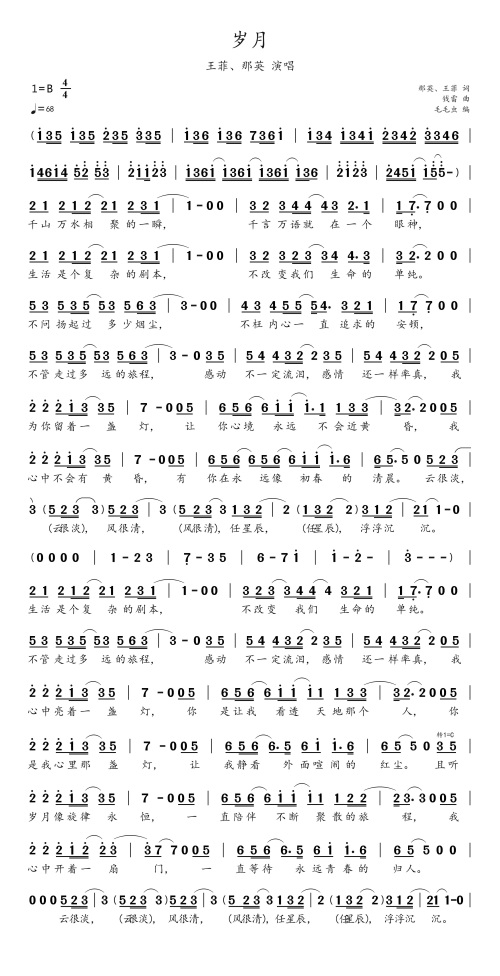 简谱:《岁月》-王菲、那英作词、演唱,钱雷作曲