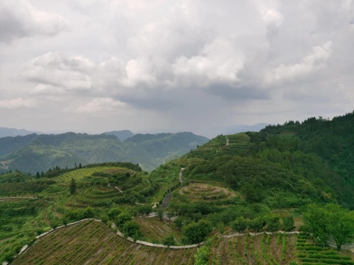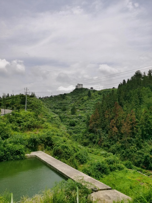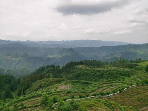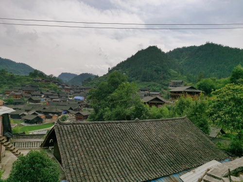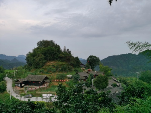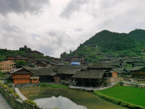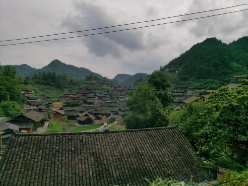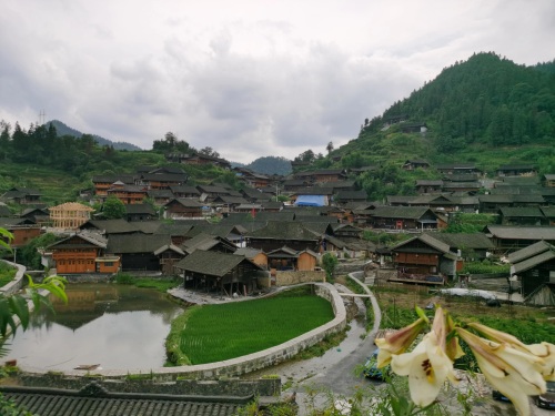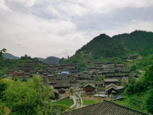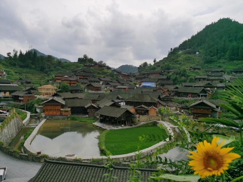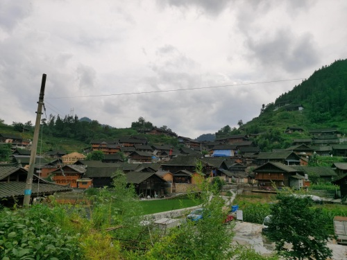 大片黑瓦木墙的苗家村屋,依山随势,层层叠叠地散落在山坡上。溪流穿村而过、良田青翠欲滴,与蓝天、群山、古树共成一画,正是《归园田居》中“暧暧远人村,依依墟里烟”的风景。