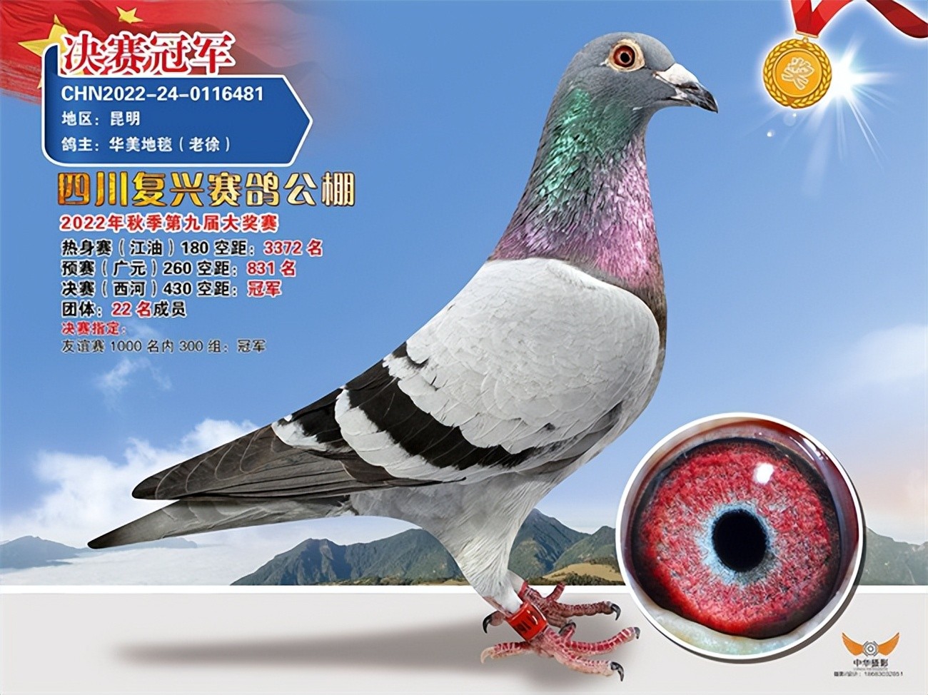 位于资阳市乐至县佛兴镇的复兴赛鸽公棚,今年为其第九届比赛,决赛飞北线,在甘肃西河放飞,赛鸽需飞越大巴山脉,是一条很有挑战的赛线,也正因为此,只有三分之一左右的赛鸽归巢。决赛冠军鸽主华美地毯(老徐)共交鸽31羽,决赛归巢16羽,进奖7羽,冠军2022240116481也是其中一员。这羽赛鸽在前两关的表现还比较不错,决赛关拿下冠军并不意外。