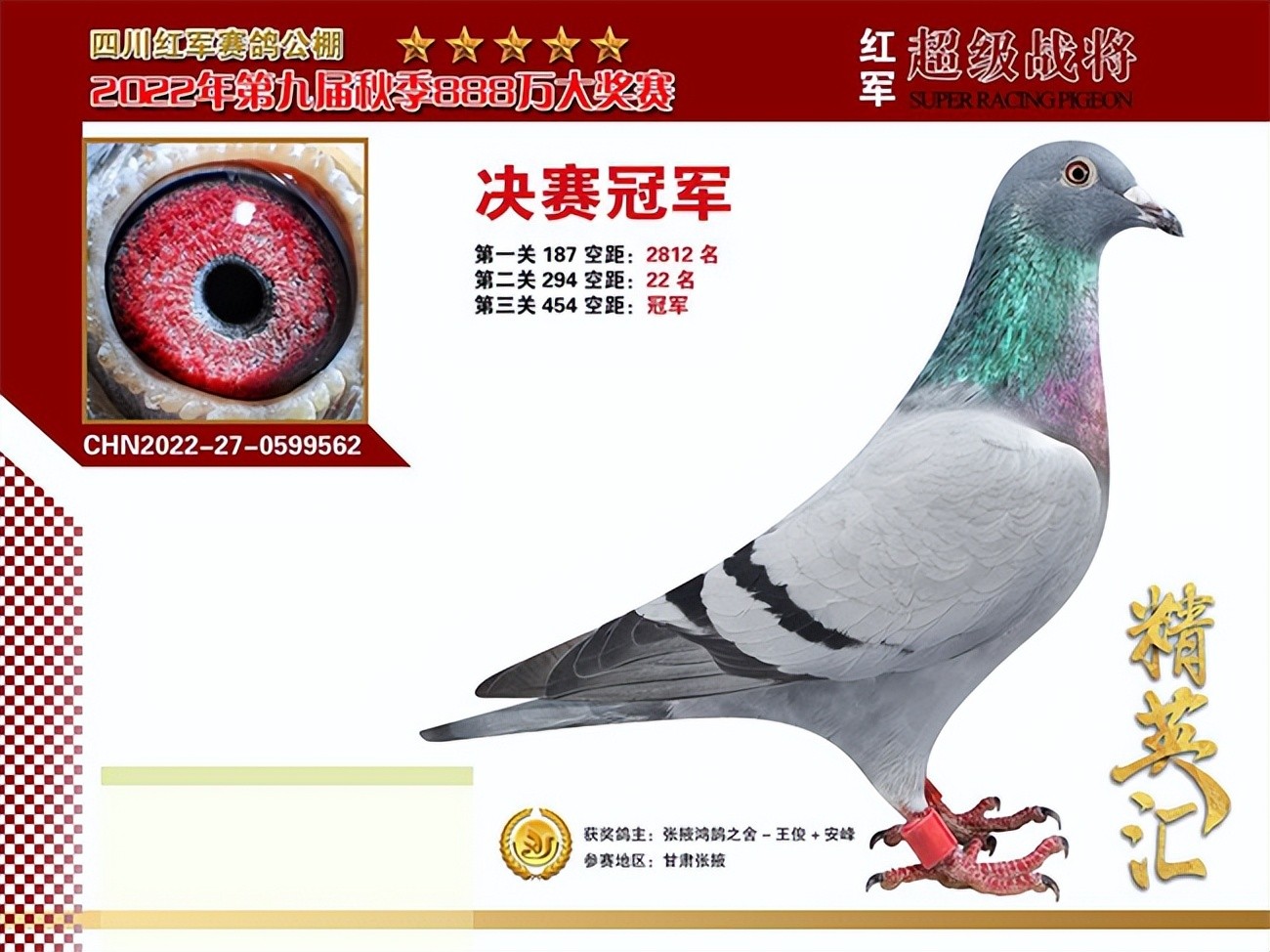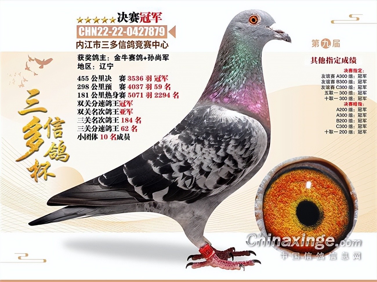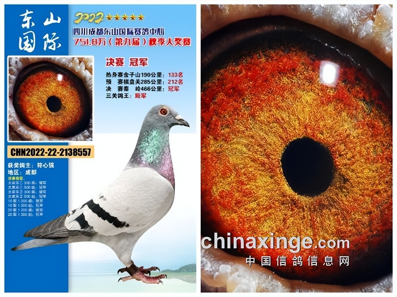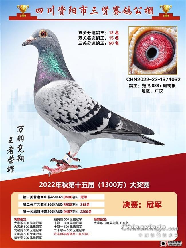 决赛冠军1374032,在比赛中除了帮助主人赢得了丰厚的奖金之外,同时还赢得了一辆汽车,真是一炮双响。同时,冠军还有一羽同窝也参赛获得310名。这两羽是盖比+胡本的血统,父母双方都是多次在地方赛获奖、身经百战的“老将”。在被主持人问及获奖感言时,鸽主脱口而出:“我很激动!”也希望屏幕前的鸽友们能够在新的一年获得好成绩。