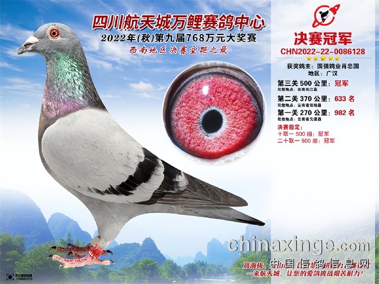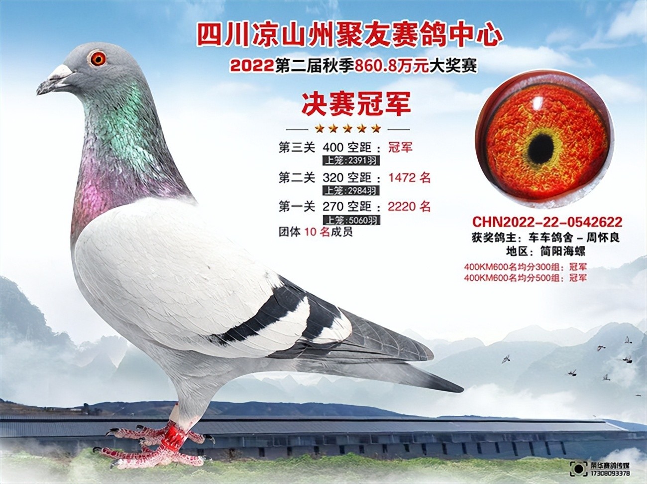 决赛空距500公里,放眼川渝地区的公棚并不多见,也许这是航天城万鲤公棚的野心。位于凉山州西昌市月华乡的航天城万鲤公棚,今年为其第九届比赛,参赛费为每羽1500元。2022年公棚收鸽7333羽,打到决赛上笼1160羽,当日归340羽,共归巢574羽。决赛冠军2022-22-0086128,在前两关表现较佳,不过鸽主并没有对它格外青眼,有点可惜。