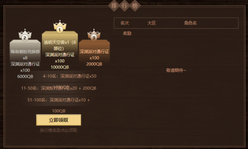 顺利通过四位NPC的默契考验,即可参与默契排行榜抢位,默契排行榜将于6月25日晚19:00开启,玩家可点击排行榜下方的“立即领取”按钮进行抢位,前100名玩家将依据排名获得相应奖励