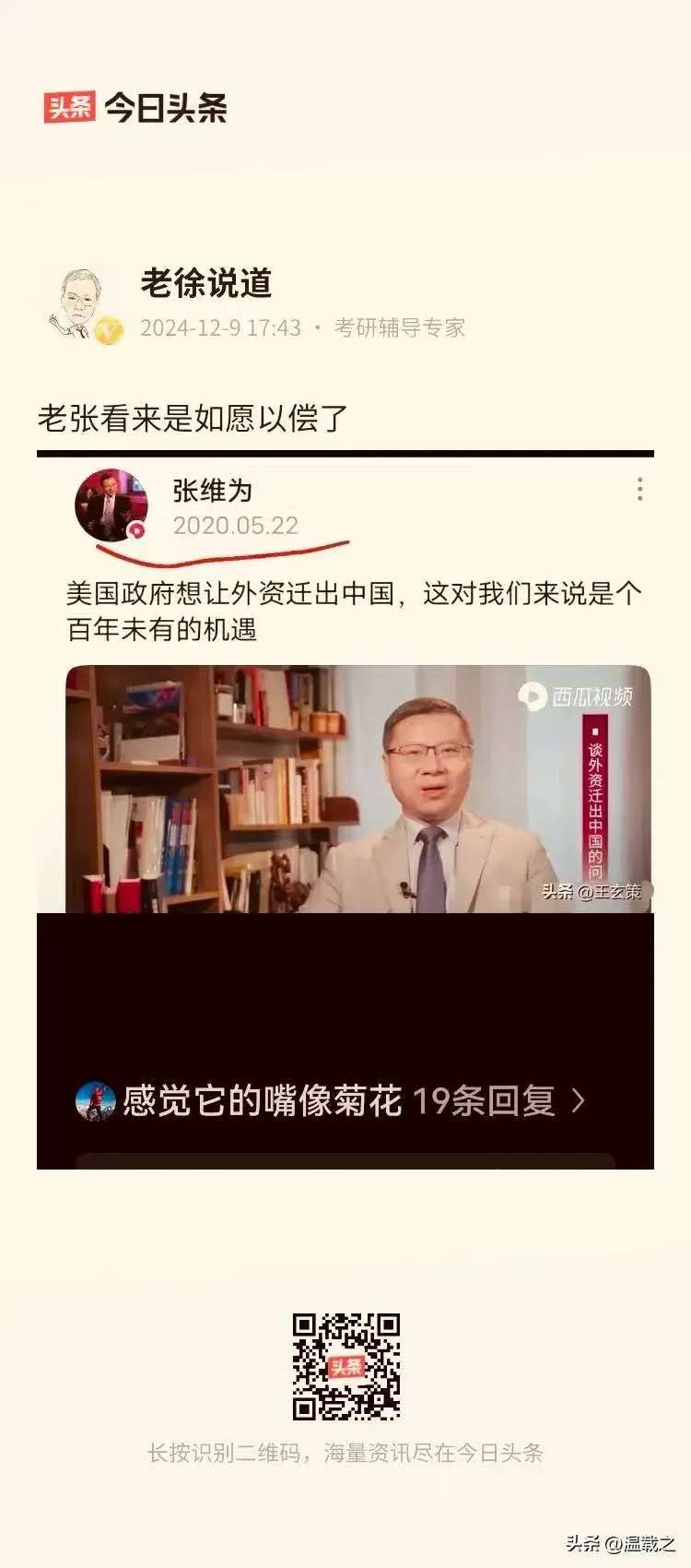 面对着复杂的国际大环境,网络上经常有关于某某外资企业撤离中国市场的报道,有人忧心忡忡,有人则乐见其成。忧心忡忡的人,担忧的是很多家庭会因为失业而陷入经济的困境。乐观其成的人,则坚定的认为,这是我们国内企业的大好的机遇,可以趁机收复很多“失地”。张维为教授无疑是乐观其成一派的典型代表,他在2020年就已经预判到了今天的形势,并且乐观的鼓励大家:美国政府想让外资迁出中国,这对我们来说是个百年未有的机遇!