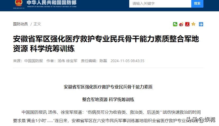 中华人民共和国国防部所发布《安徽省军区强化医疗救护专业民兵骨干能力素质整合军地资源 科学统筹训练》