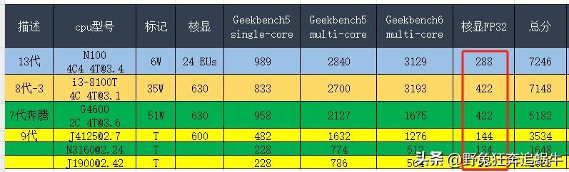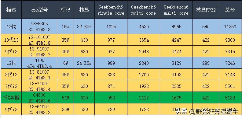 作为对比,我列举了N100、i3-8100T、J4125等几个有代表性的cpu。
