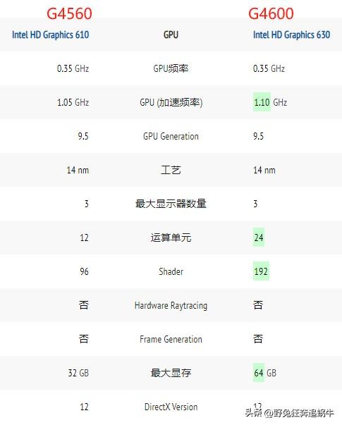 核显差异较大,G4560核显型号是610而G4600核显型号是630。