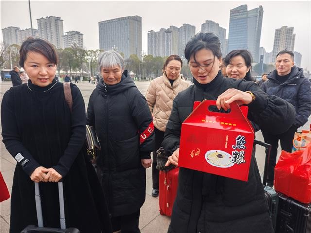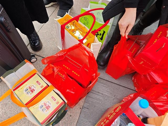 唐悦:“今天我的家人都是回四川绵阳的,他们很大一部分人都是第一次来到荆州,像荆州的鱼糕,还有矮子馅饼、小胡鸭,还有草莓还有一些水果,虽然暂时是离开荆州,但是把荆州的感受以及荆州的风味都能带回四川,分享给没能来到的亲友。”