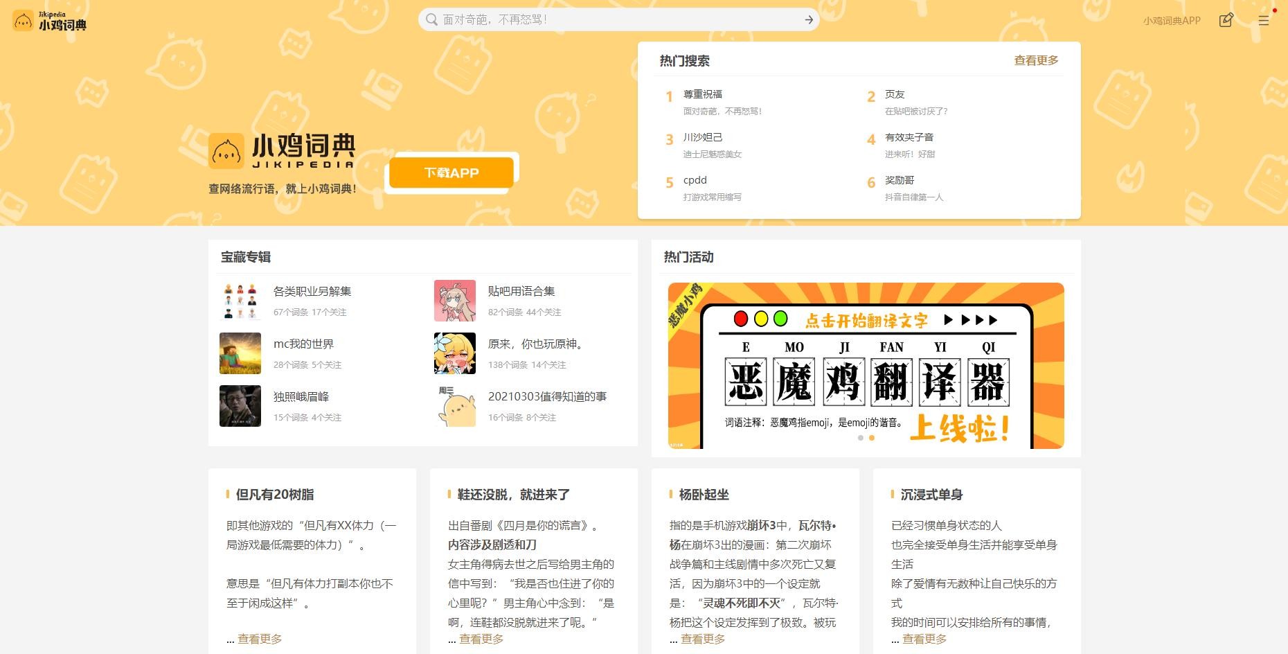 在小鸡词典网站中,用户可以快速地查询网络用语。作为网络时代的冲浪人,时刻围观最新八卦和了解时事热点,并和志同道合的朋友一起构建新兴文化社区,见证、参与流行文化的发展。
