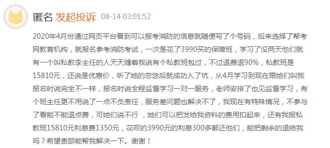 环球网记者发现,类似的纠纷并不少见。宣称是专注于职业教育领域的帮考网由于涉嫌虚假宣传、诱导学员贷款及退费难等诸多问题遭消费者投诉。有消费者在黑猫投诉平台上反映称2020年4月份通过网页平台看到报考消防的信息便填写了手机号码,之后选择帮考网进行学习并报名消防考试,第一次花费3990元参加保障班学习,之后有一位自称私教的李主任的工作人员建议消费者报名私教班并声称包过,如不过可退费90%,私教班费用为15810元,并且是优惠价,消费者之后报名了私教班,然而消费者发现,从4月份学习至今,所学的内容与工作人员此前所描述的完全不同,报名时帮考网工作人员称将全程监督学习并提供一对一服务,然而班主任并不负责任,服务差、问题也解决不了,消费者主张退费,帮考网工作人员表示私教班15810元需要支付利息费用1350元,并且还需扣除资料费等。