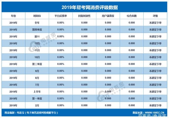据查,电商专业消费调解平台“电诉宝”此前公布了“2020年Q1全国生活服务电商TOP10消费评级榜”,其中,“帮考网”综合指数低于0.4,获“不建议下单”的购买评级,存在“退款问题、霸王条款、网络售假、虚假促销”等问题。此外,2019年度“帮考网”共获得13次消费评级,均获“不建议下单”评级。
