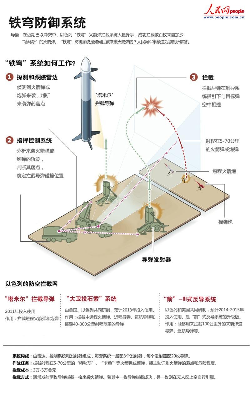 铁穹反火箭弹防御系统由以色列国有军工企业拉斐尔国防系统公司研发,是一种全天候、机动型火箭拦截系统,主要用于拦截近程火箭弹。它一般由 1 部多功能相控阵雷达、1 套战场管理及武器控制系统、3 到 6 部 20 联装发射装置组成。
