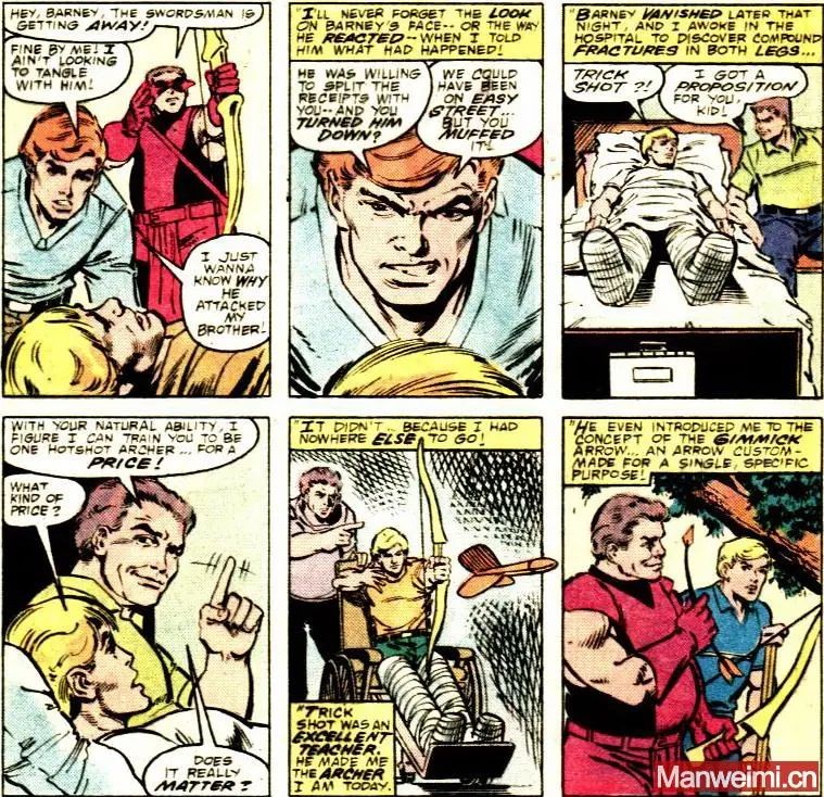 在与导师关系恶化后,花式射击手巴克将克林特带回了家,并邀请他成为他的得意门生,试图在他康复后继续接受射箭训练。就这样,在没有其他选择下,克林特同意了。在四年的时间里,每天8小时,花式射击手教授了他所有自己所知的关于射箭的知识,并向他介绍了“特殊箭”的概念,每一支箭都可配备不同的小工具或诡计。