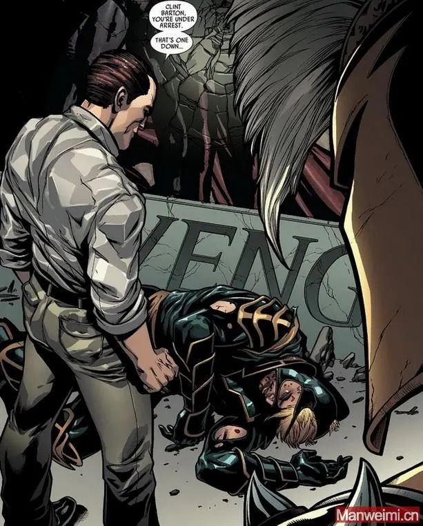 在团队的其他成员不赞同的情况下,克林特仍单枪匹马闯入复仇者大厦,试图实现他的目标,但被该团队成员“阿瑞斯(Ares)”从背后袭击,遭到逮捕。最后,在被复仇者队友们救出后,他为自己的错误行为向他们道歉。