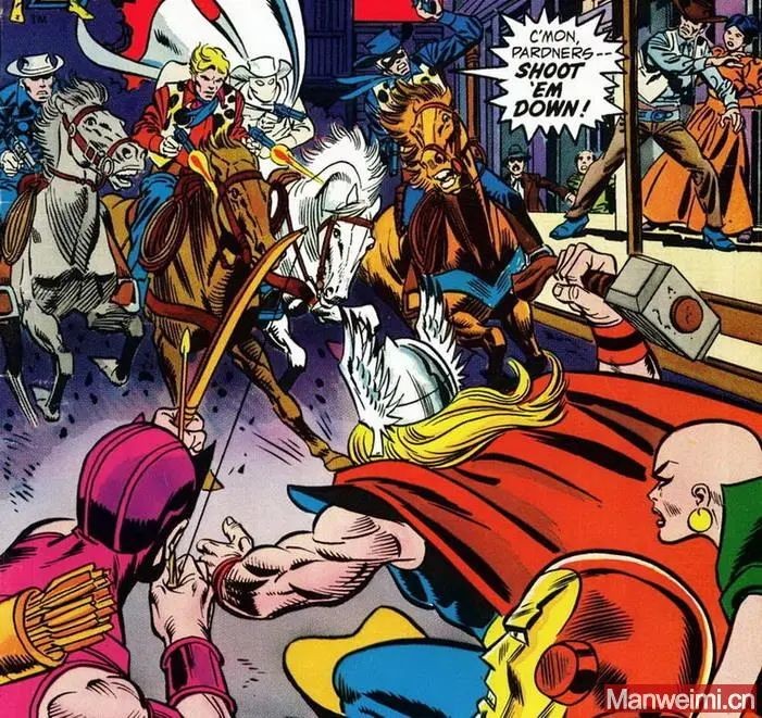 后来,在一次与“征服者康(Kang the Conqueror)”的战斗中克林特被时间涡流困在了1870年代的美国西部,迅速与“双枪小子(Two-Gun Kid)”结下友谊,在与复仇者们并肩打败康后,他带着西方英雄双枪小子一同返回了现代。