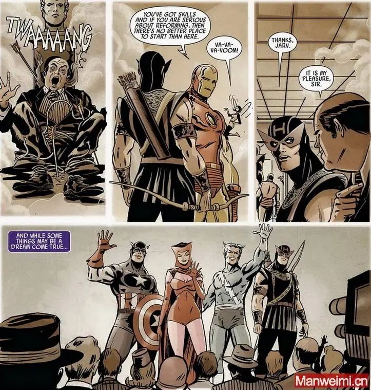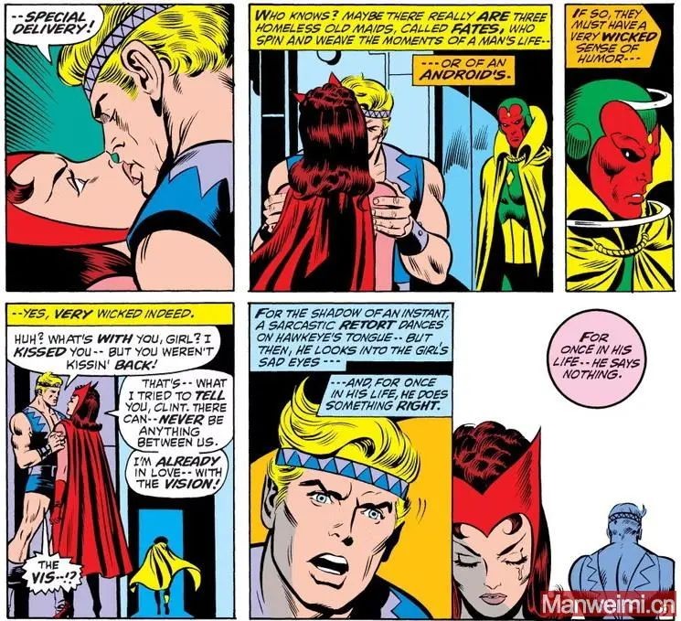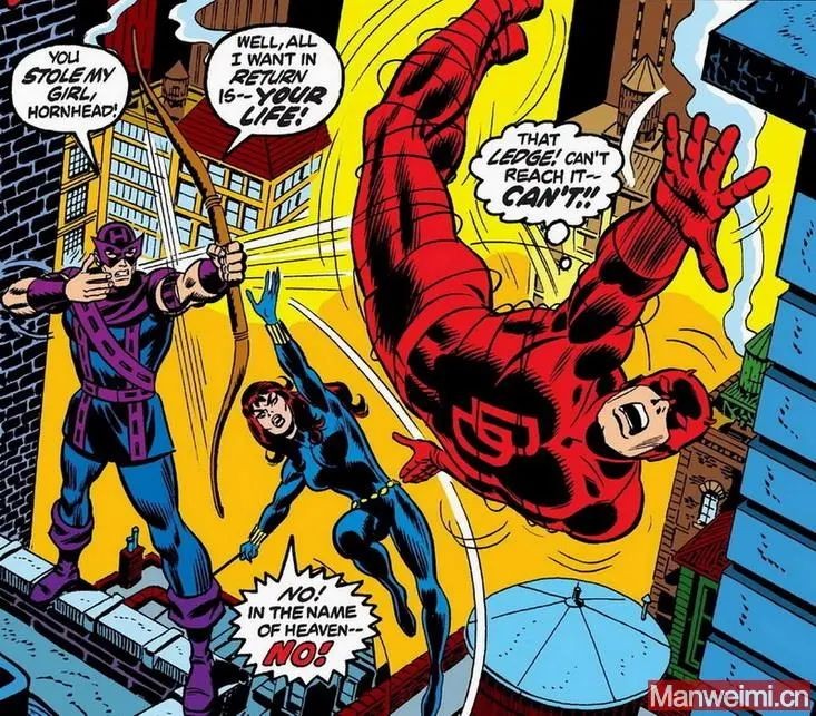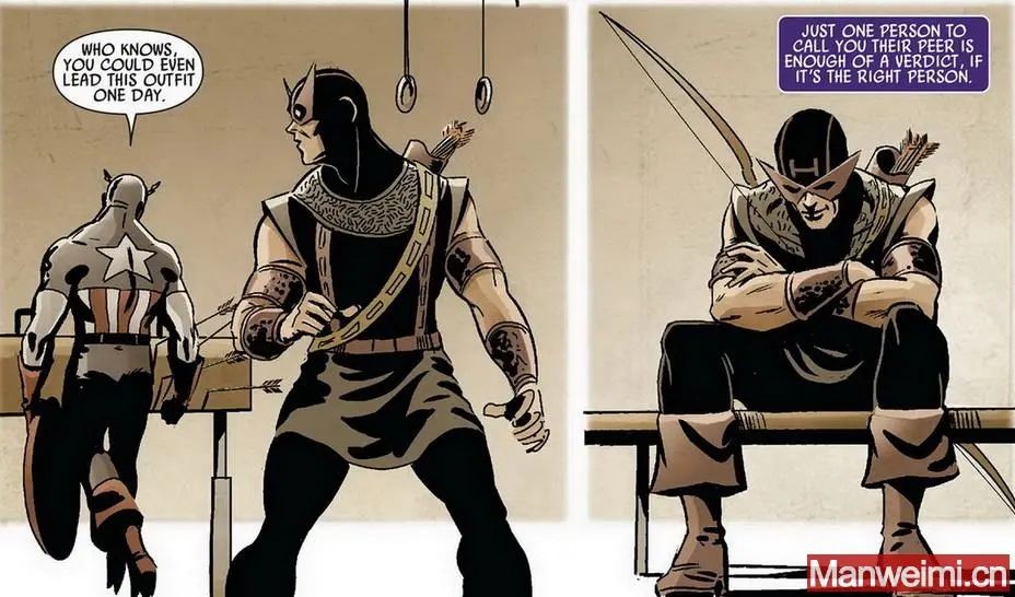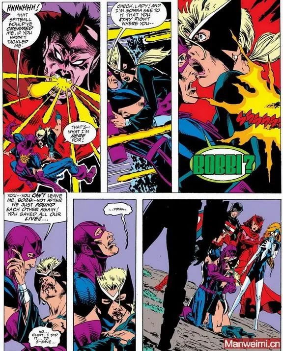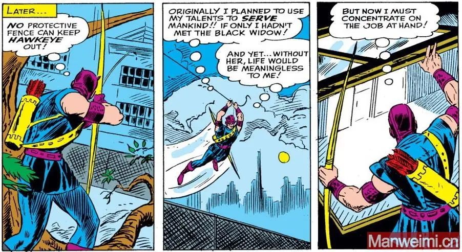 在之后的冒险中,克林特试图回到黑寡妇身边重修旧好,结果和她的现任男友、新加入复仇者的“夜魔侠(Daredevil)”打了一架,他也因此(分手而伤心)拒绝回归复仇者而对抗万磁王(Magneto)。