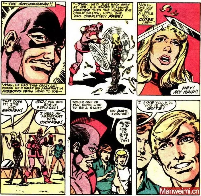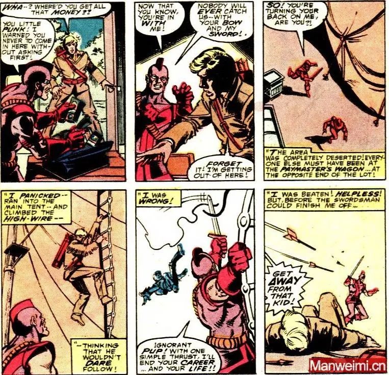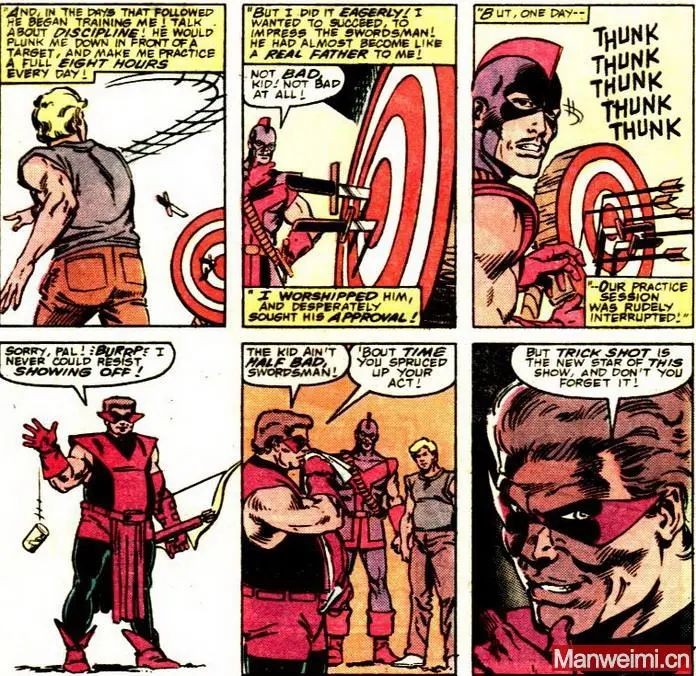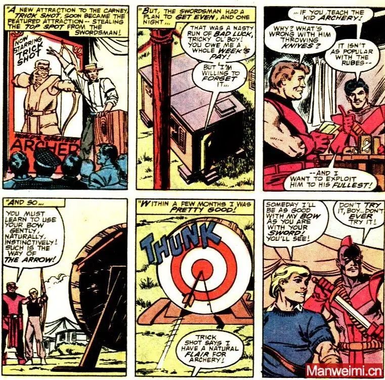 很快,杂技团中擅长飞刀的核心表演者雅克·迪凯纳(Jacques DuQuesne),又名“剑客(Swordsman)”,看中了克林特的天分和胆量,并将其纳入麾下。后因,巴克·奇泽姆(Buck Chisholm)又名“花式射击手(Trickshot)”的到来使情到来使情况变得更加复杂,他是一个没有底线的弓箭手,并超越了剑客的影响力,成为马戏团的头号人物。