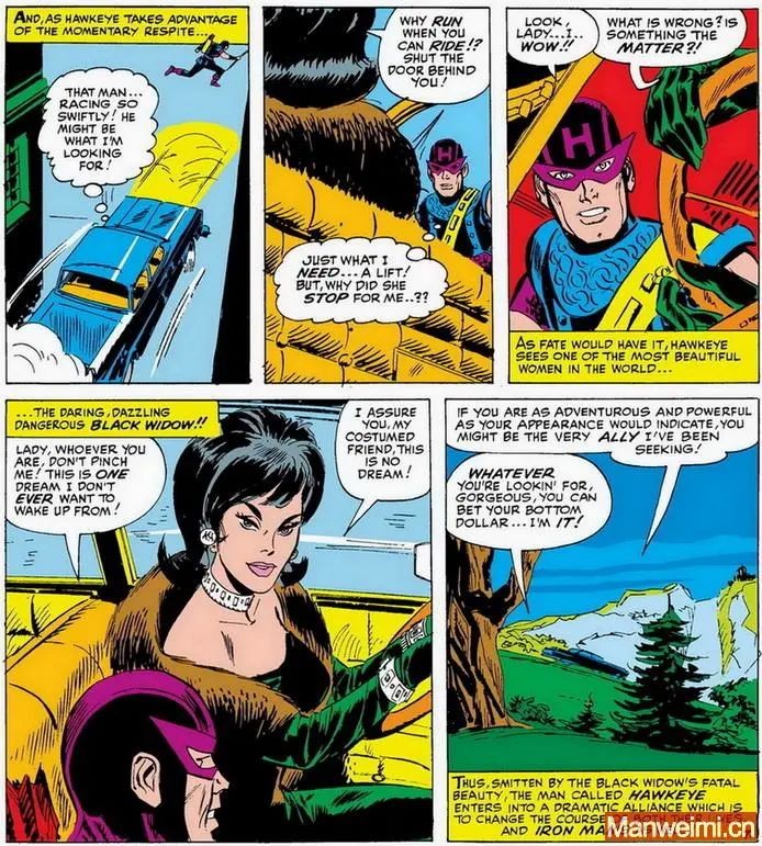 在逃亡途中,天真的鹰眼遇到了俄罗斯超级间谍“黑寡妇(Black Widow)”,并被她招募作为自己的搭档。同时,在这位性感的间谍迷惑下,克林特盲目地跟随而放弃了成为英雄的计划,并多次帮助黑寡妇对抗他的宿敌钢铁侠和蜘蛛侠,来吸引她的关注。