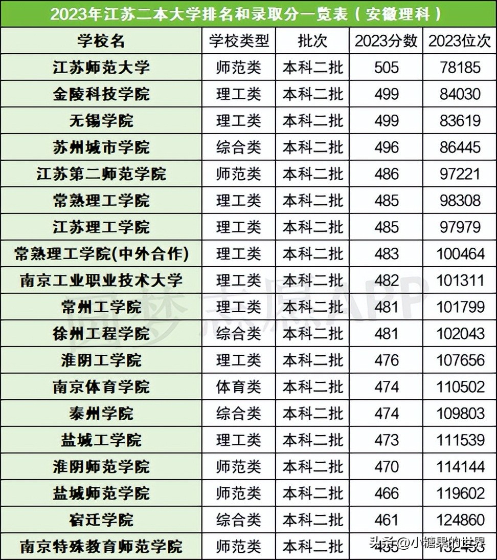 由于江苏目前实行的是新高考模式,一本和二本批次合并为了本科批次,因而本期以2023年仍实行旧高考模式的安徽省为例,整理了江苏各大学在该省二本批次的录取分数线,如下: