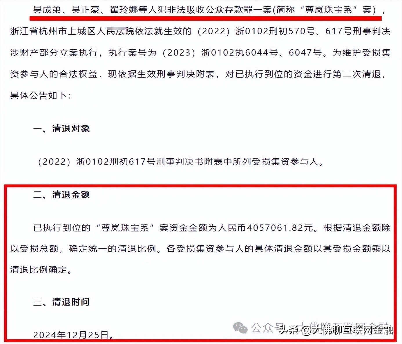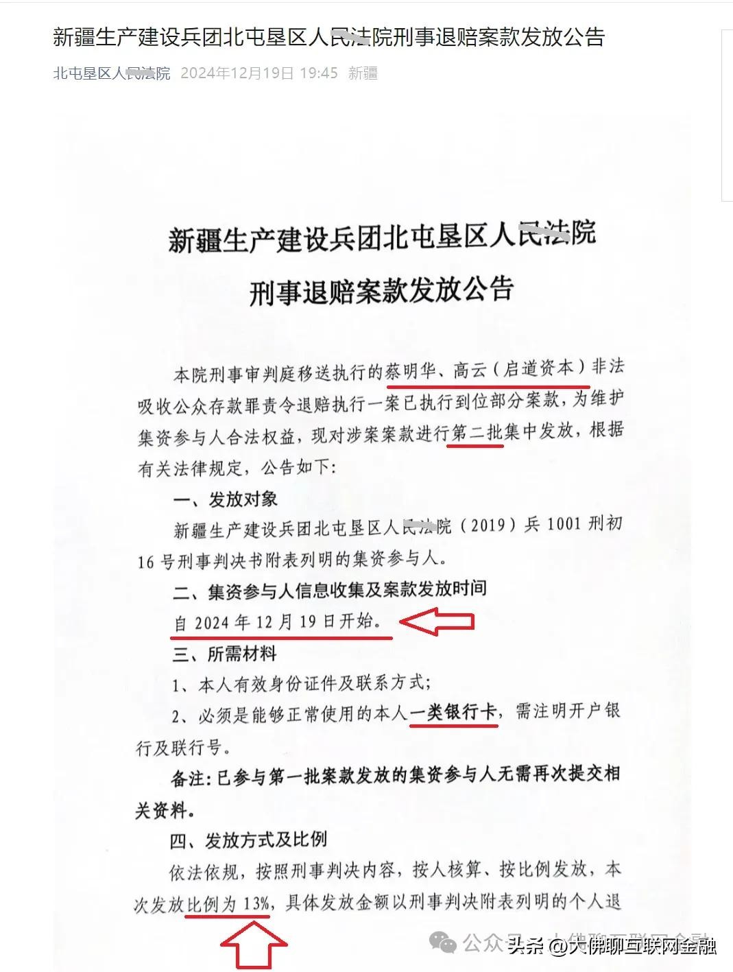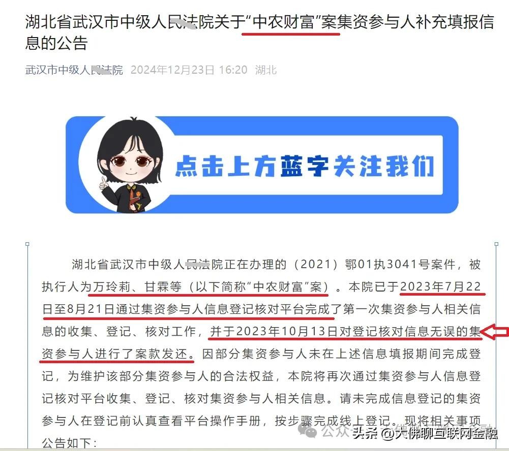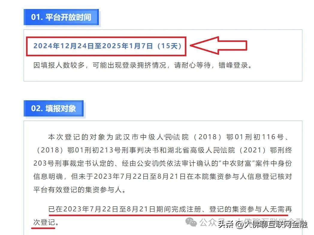 ②“中农财富”案,此次为补充登记,登记时间从2024年12月24日至2025年1月7日止,为期15天。该案第一次核对登记是在2023年7月22日至8月21日,后在同年10月13日进行了首次退赔,当时未公布具体金额及比例。