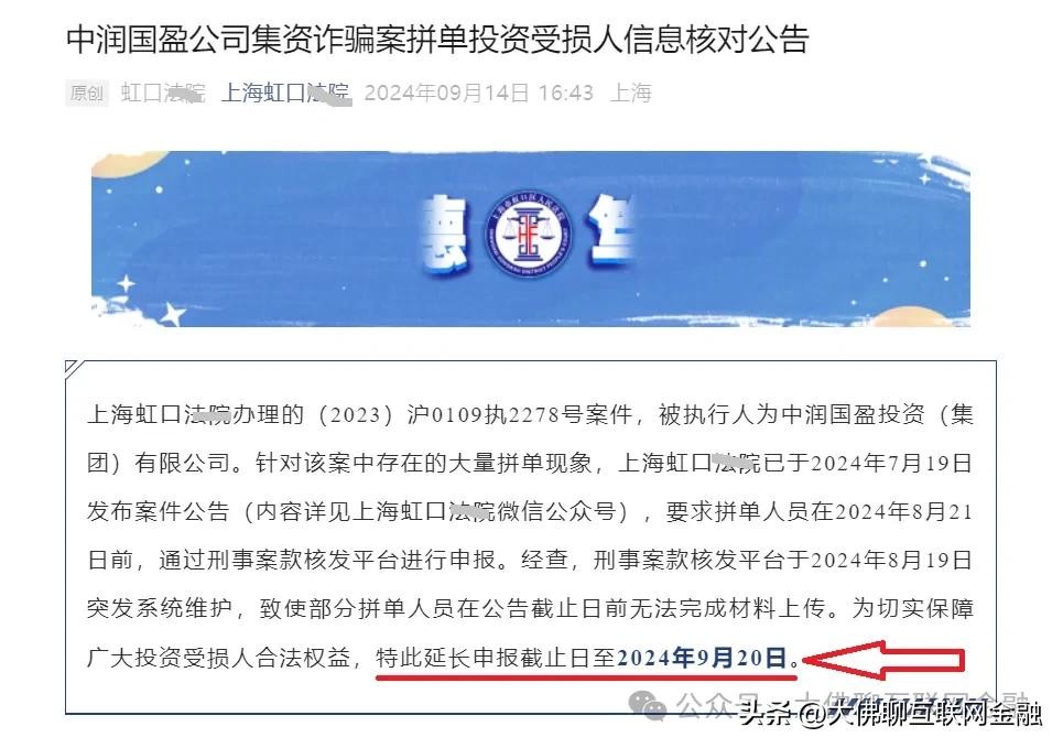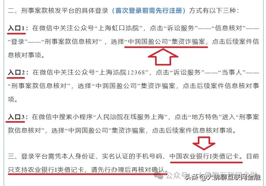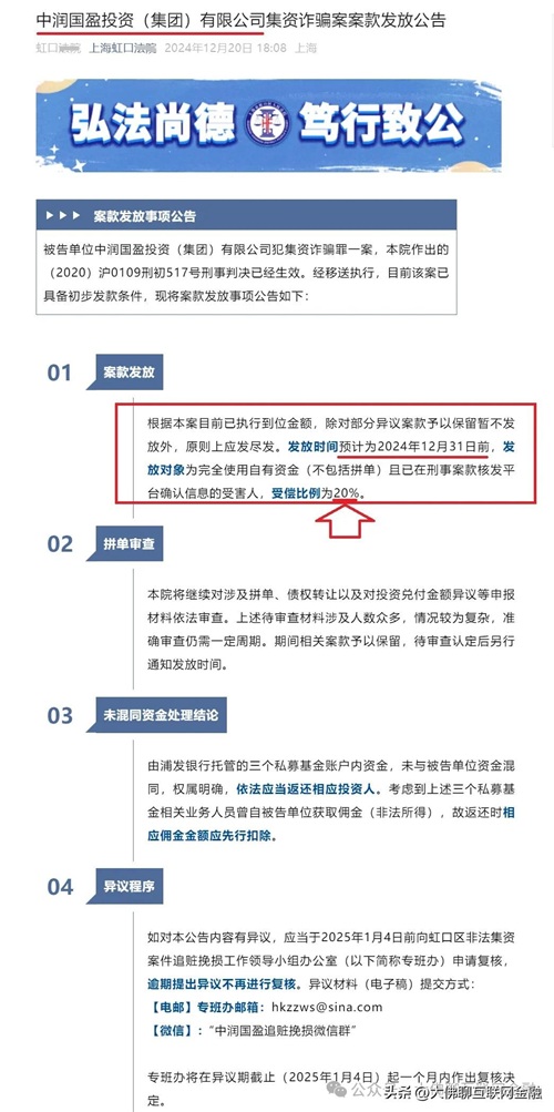 2024年12月20日发布了中润国盈投资(集团)有限公司集资诈骗案案款发放公告。前期已按要求办理核对登记的受损人,可以留意核对时填写的农行I类借记卡的到账情况。